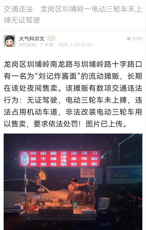 8. 帖文《交通违法:龙岗区圳埔岭一电动三轮车未上牌无证驾驶》
