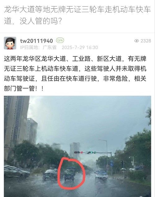 6. 帖文《龙华大道等地无牌无证三轮车走机动车快车道,没人管的吗?》