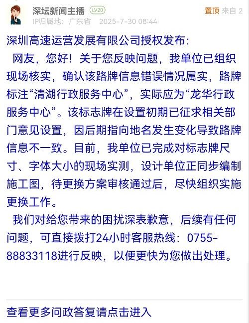 网友,您好!关于您反映问题,我单位已组织现场核实,确认该路牌信息错误情况属实,路牌标注“清湖行政服务中心”,实际应为“龙华行政服务中心”。该标志牌在设置初期已征求相关部门意见设置,因后期指向地名发生变化导致路牌信息不一致。目前,我单位已完成对标志牌尺寸、字体大小的现场实测,设计单位正同步编制施工图,待更换方案审核通过后,尽快组织实施更换工作。
