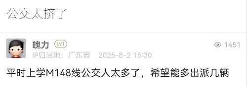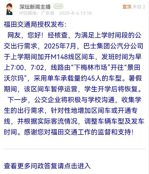网友,您好!经核查,为满足上学时间段的公交出行需求,2025年7月,巴士集团公汽分公司于上学期间加开M148线区间车,发班时间为早上7:00、7:02,线路由“下梅林市场”开往“景田沃尔玛”,采用单车承载量约45人的车型。暑假期间,该区间车暂停运营,学生开学后将恢复。