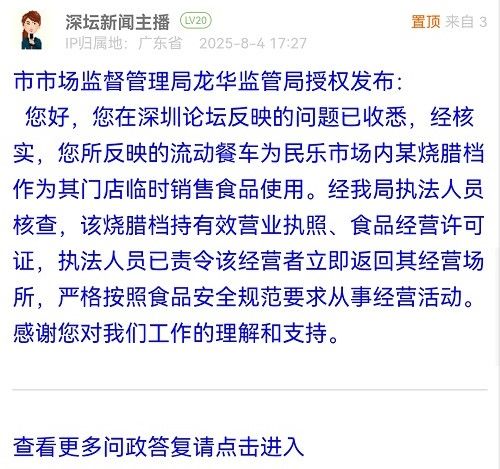 您好,您在深圳论坛反映的问题已收悉,经核实,您所反映的流动餐车为民乐市场内某烧腊档作为其门店临时销售食品使用。经我局执法人员核查,该烧腊档持有效营业执照、食品经营许可证,执法人员已责令该经营者立即返回其经营场所,严格按照食品安全规范要求从事经营活动。感谢您对我们工作的理解和支持。