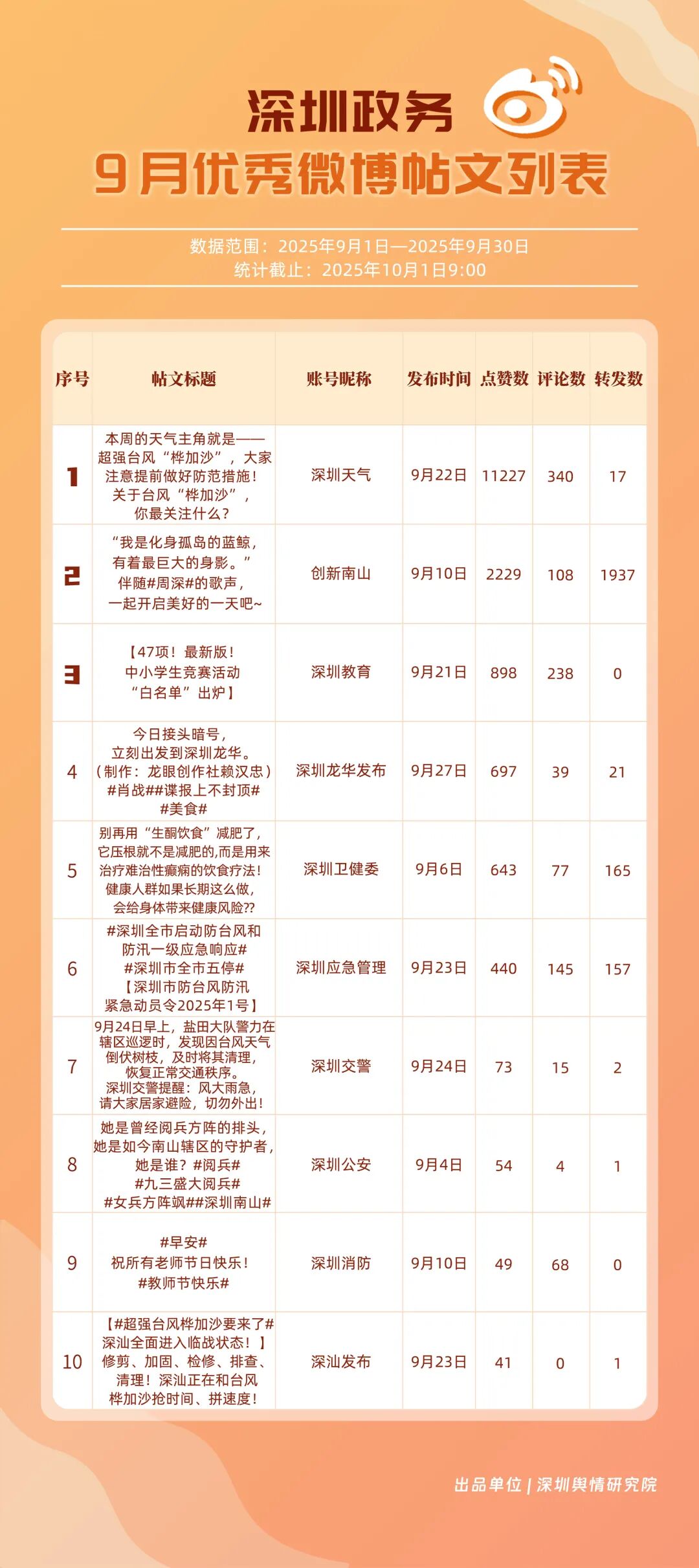 9月,20个账号入选“优秀政务微博号”榜单,其中包括:“深圳天气”“创新南山”“深圳龙岗发布”“深圳卫健委”“深圳消防”“深圳应急管理”“福田发布”“深圳公安”“深圳交警”“深圳教育”等。其中,“深圳天气”蝉联榜首,尤其9月出现台风天气,账号受关注度再提升;“创新南山”账号以多维度内容策略实现传播效能提升,其内容中与歌手周深的联动也成为一大亮点,获得了较好传播效果,以94.34分排名榜单第二;“深圳龙岗发布”“深圳卫健委”两账号得分均在93分以上,在区域宣传、内容科普方向发力。上榜优秀微博账号展现出较高的内容创新能力,以年轻化语态构建传播体系,形成兼具专业性与传播力的优秀案例。