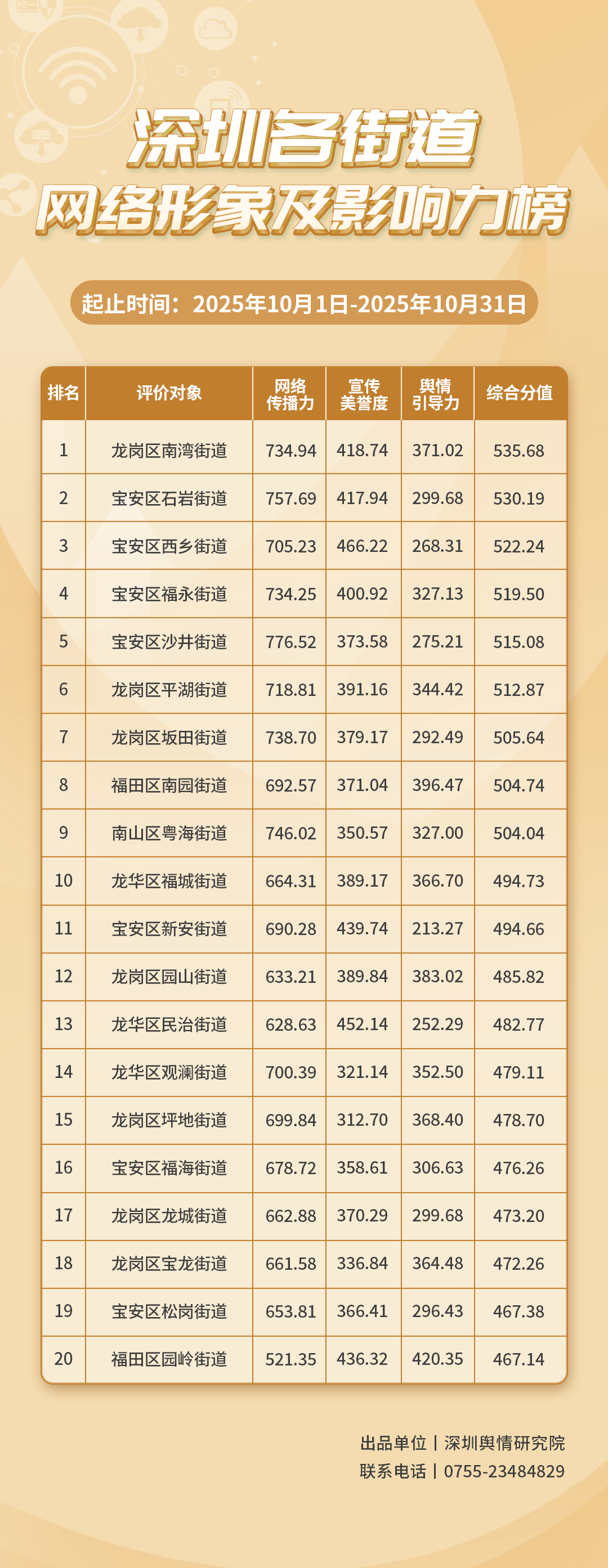 10月,各街道主动深耕社交平台的传播规律,优化拓展基层治理。《深圳各街道网络形象及影响力榜》(10月榜单)已编制完成,对各街道在网络空间的展现及其影响力进行了全面的观察与评估。本次榜单的数据统计时间跨度为2025年10月1日至10月31日。